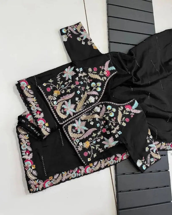Black Premium Chiffon Saree with Embroidery & Designer Blouse | BharatPlaza