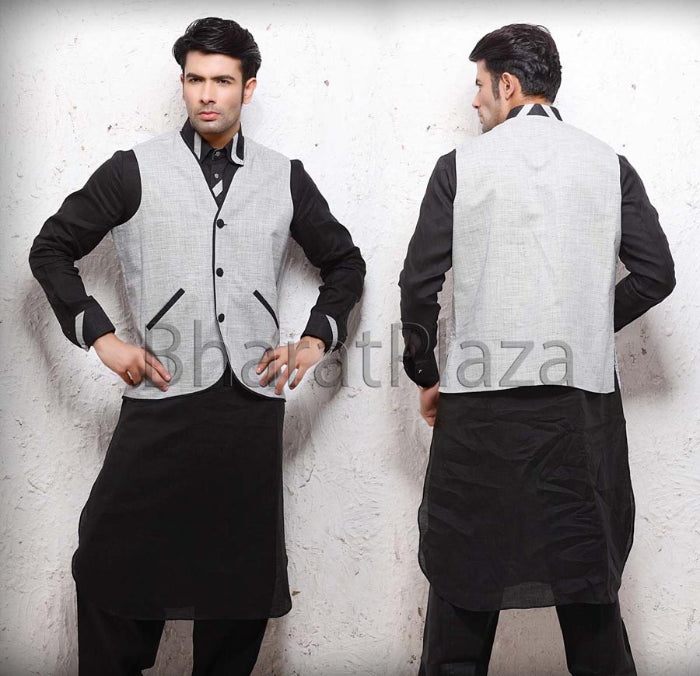 Black Pathani Suit with Grey Trendy Jacket – Linen Fabric