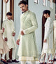 This Peach Lakhnavi Sherwani is crafted with delicate beads touching work, blending traditional craftsmanship with a subtle modern charm. Designed in a soft peach shade, it is perfect for grooms and close family members attending weddings, receptions, or engagement ceremonies. The elegant texture paired with fine detailing makes this sherwani a timeless choice for royal celebrations. Complete the look with pearl malas and mojaris for a classic regal style.
