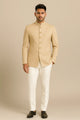 Tailored Terry Rayon sherwani ka clean, structured silhouette, classic bandhgala neckline aur refined metallic buttons ke saath ek modern-royal look create karta hai.