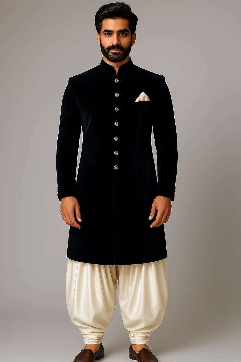 Black Velvet Indo Western Coat with Cream Patiala Baggy – Royal